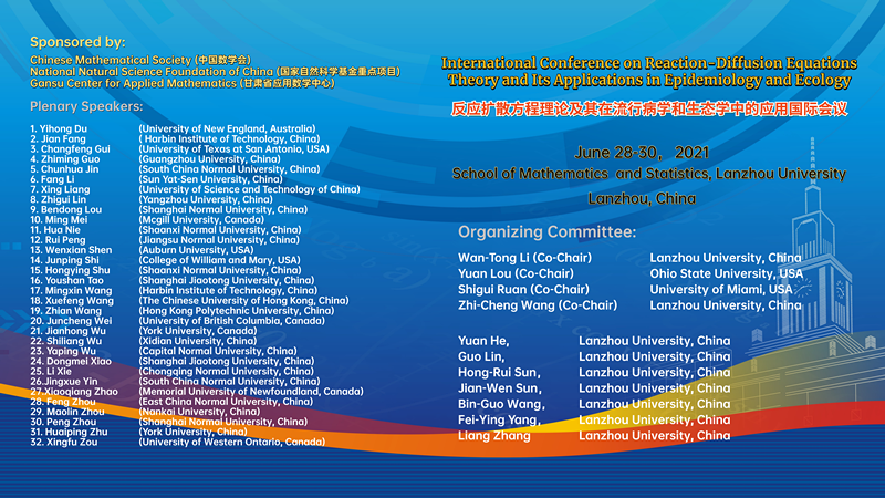 2021年6月28日至30日,经教育部批准,受伟德体育伟德体育官方网站、中国数学会、国家自然科学基金重点项目资助,由甘肃应用数学中心、伟德体育伟德体育官方网站主办的“反应扩散方程理论及其在流行病学和生态学中的应用国际会议(International Conference on Reaction-Diffusion Equations Theory and Its Applications in Epidemiology and Ecology)”以腾讯会议线上形式成功举办。一百多位来自美国、加拿大、澳大利亚以及中国香港和内地的专家学者、青年教师和研究生参加了本次会议,三十多名学者做了学术报告,其中包括来自加拿大皇家科公司院士、英属哥伦比亚大学魏军城教授,澳大利亚科公司院士、新英格兰大学杜一宏教授,美国德克萨斯大学桂长峰教授,美国俄亥俄州立大学楼元教授,美国迈阿密大学阮士贵教授,美国奥本大学沈文仙教授,美国威廉玛丽公司史峻平教授,加拿大应用数学研究主席、约克大学吴建宏教授,加拿大纽芬兰纪念大学赵晓强教授,加拿大麦吉尔大学梅茗教授,以及香港理工大学、香港中文大学(深圳)、中国科学技术大学、上海交通大学、南开大学、中山大学、哈尔滨工业大学、华南师范大学、西安电子科技大学、上海师范大学、首都师范大学、广州大学、江苏师范大学、重庆师范大学等国内著名院校的专家学者。
