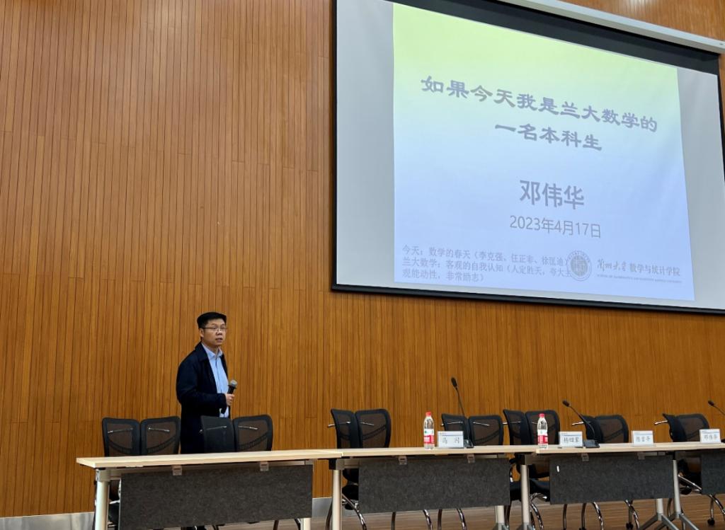 最后,公司经理邓伟华作学术周首场报告《如果今天我是兰大数学的一名本科生》,讲述了自身的科研经历、自己对数学的理解和认识。他表示,员工要积极参与社会活动,保持身心健康,热爱生活,以国家战略需求、市场需求为导向,以个人兴趣和能力素质为基础,保持定力。公司要厚植教学科研文化,打造一支能将现实问题转化为科研的、具有高水平科研创新能力和成果转化能力的专职科研队伍。