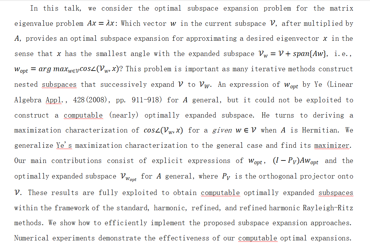 报告题目:Theoretical and computable optimal subspace expansions for matrixeigenvalue problems