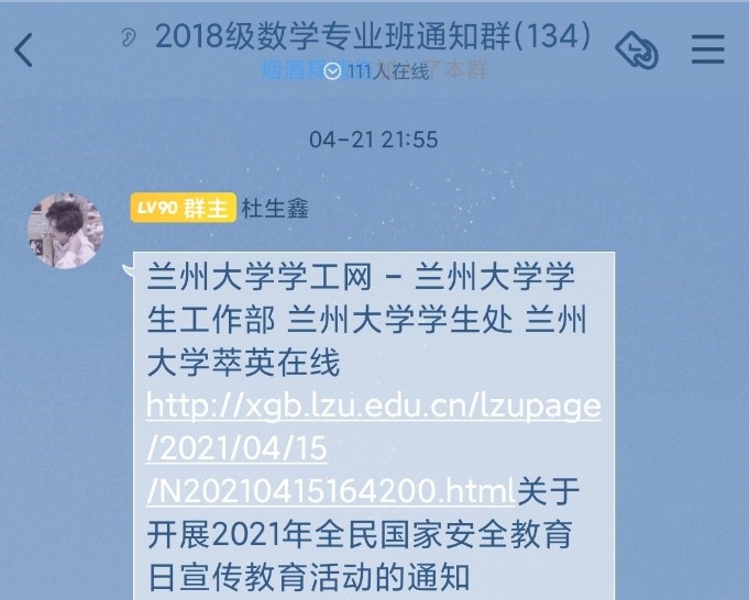 伟德体育伟德体育官方网站2019级基地班于2021年4月15日在榆中校区第二教学楼A114开展了国家安全教育的主题班会,时值4月15日第六个全民国家安全教育日。班会主题为“践行总体国家安全观,统筹发展和安全,统筹传统安全和非传统安全,营造庆祝建党100周年良好氛围”,使国家安全概念普及化,每人都构筑起一道保卫国家的安全长城。
