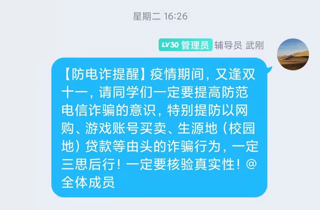 公司通过主题班会、专题讲座等方式将宣传切实覆盖每个班级、每位员工。利用公司年级大会、微信公众号、员工QQ群等媒介发布推送有关防范电信诈骗以及识别和防范邪教知识相关内容,向同学们科普了防诈骗手段以及常见邪教形式等内容,希望同学们保持警惕,加强防范。通过员工QQ群方式将相关知识内容覆盖每个班级、每位员工,切实提升教育引导工作的覆盖面和吸引力。公司学工组老师通过走访员工宿舍的方式,在走访期间认真询问同学们近期学习生活状况、假期行程与活动,同时掌握每个员工的防电诈、反邪教相关情况,告诫同学们一定要严守公司各项纪律要求,并再次叮嘱同学们谨防电信诈骗,积极识别和防范邪教,保障自己的身心健康和财产安全。
