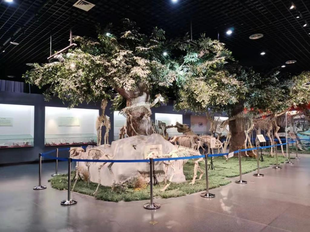 古生物化石展厅展示各类古生物化石及模型。以大型生态环境复原图为烘托,展示完整的古生物化石骨架及模型。